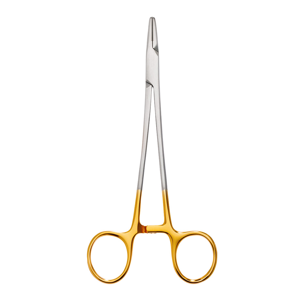 Als Kennzeichnung für die Verwendung von Hartmetalleinlagen an den Mäulern der Nadelhalter sind die Griffe vergoldet. Die hochliegenden Innensperren verhindern ein Einklemmen der Handschuhe. Die Verwendung unterschiedlicher Nadelgrößen bedingt den Einsatz entsprechender Nadelhalter mit den notwendigen Maulbreiten und Stärken. Bitte beachten Sie die Angaben am Instrument für die Benutzung des zulässigen Nahtmaterials.