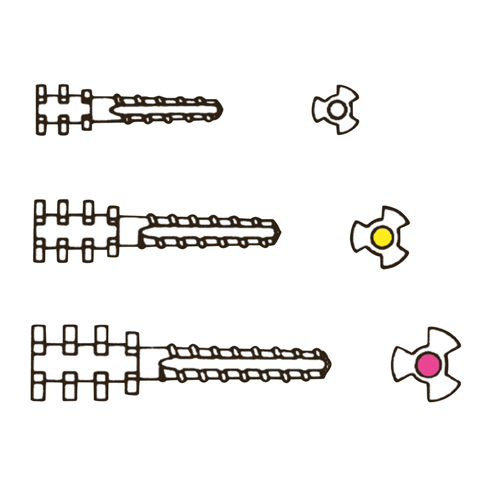 Wurzelanker mit ausladendem Retentionskopf sind aus einer Titan-Legierung mit hoher mechanischer Festigkeit, absolut korrosionsbeständig und bio-kompatibel. Die schwache Konizität des endodontischen Teiles, das selbstschneidende Gewinde und die Zementabflussrillen verhindern Spannungen beim Einsetzen des Stiftes.
