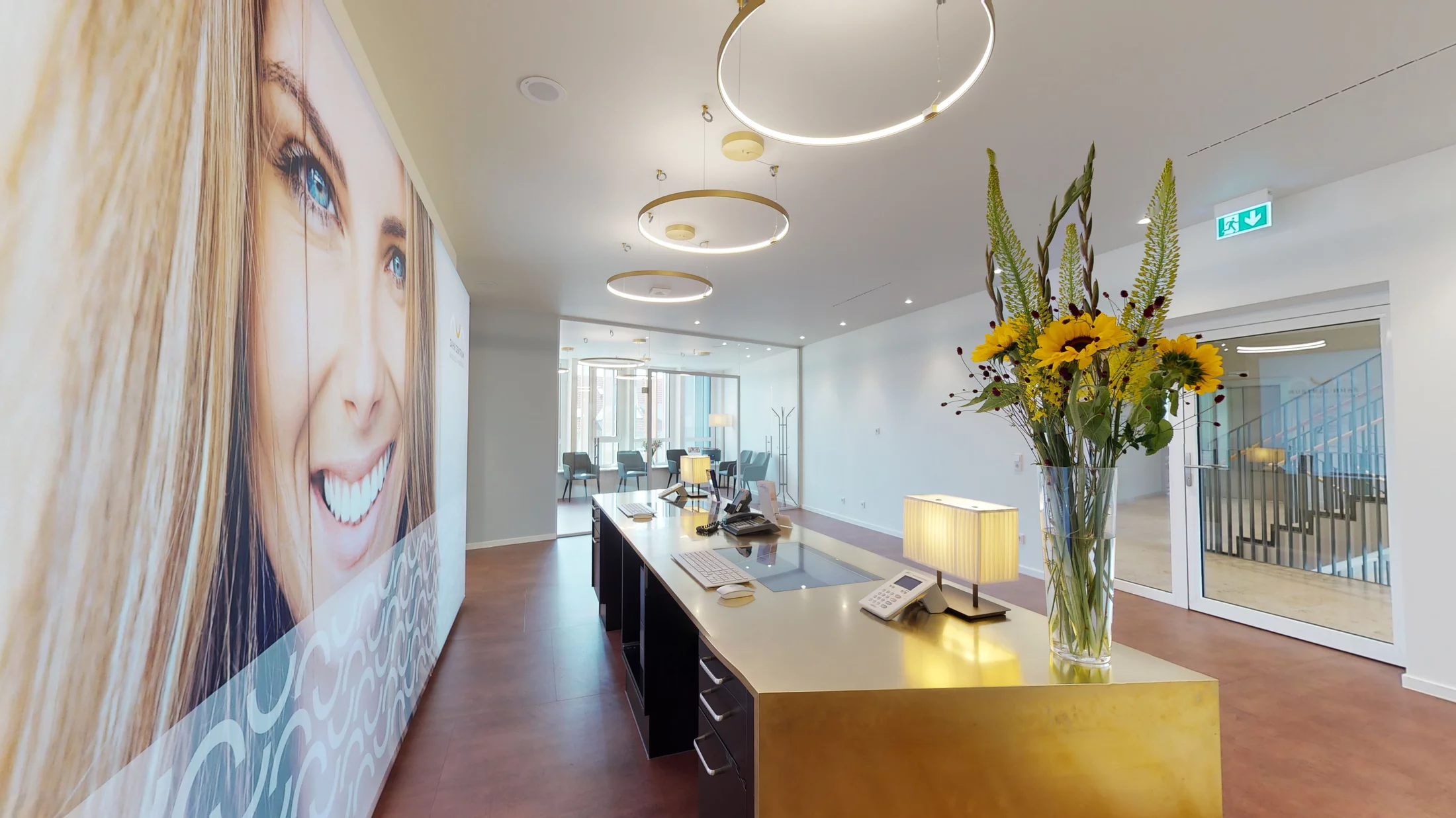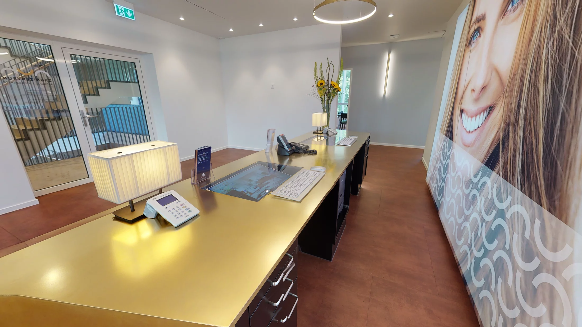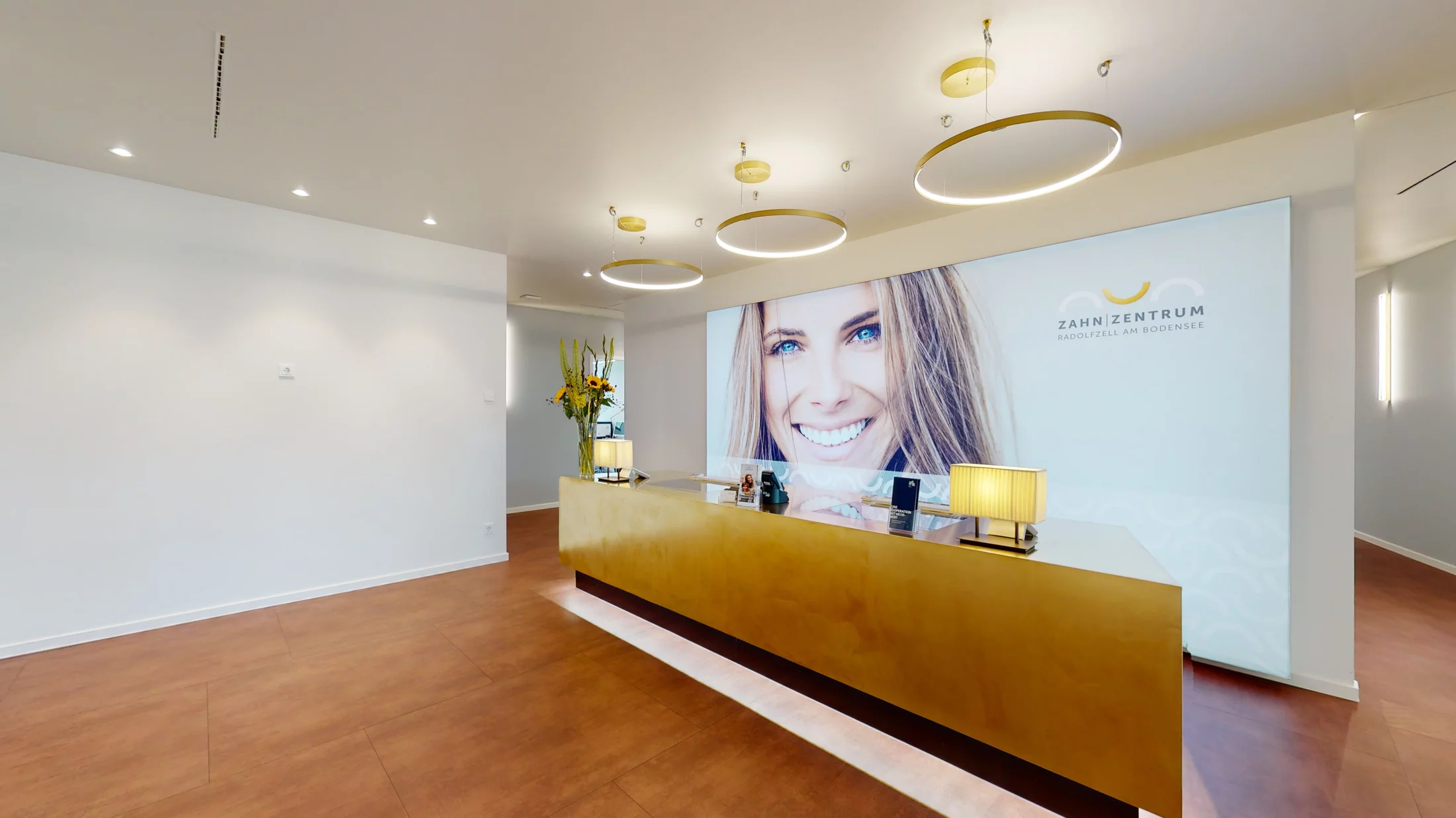Das Zahn Zentrum Radolfzell am Bodensee steht gestalterisch ganz im Zeichen des Hoteldesigns. Die Praxis erhielt einen luxuriösen Hotelcharakter, inspiriert vom Four Seasons Hotel in New York. Basis der Gestaltung ist ein Grundriss mit großzügiger Aufteilung der Behandlungs- und Wartebereiche. Hierbei bildet eine imposante Messing-Rezeption das Zentrum. Eingelassene Bildschirme und hochwertige Designleuchten unterstreichen den mondänen Hotelcharakter.