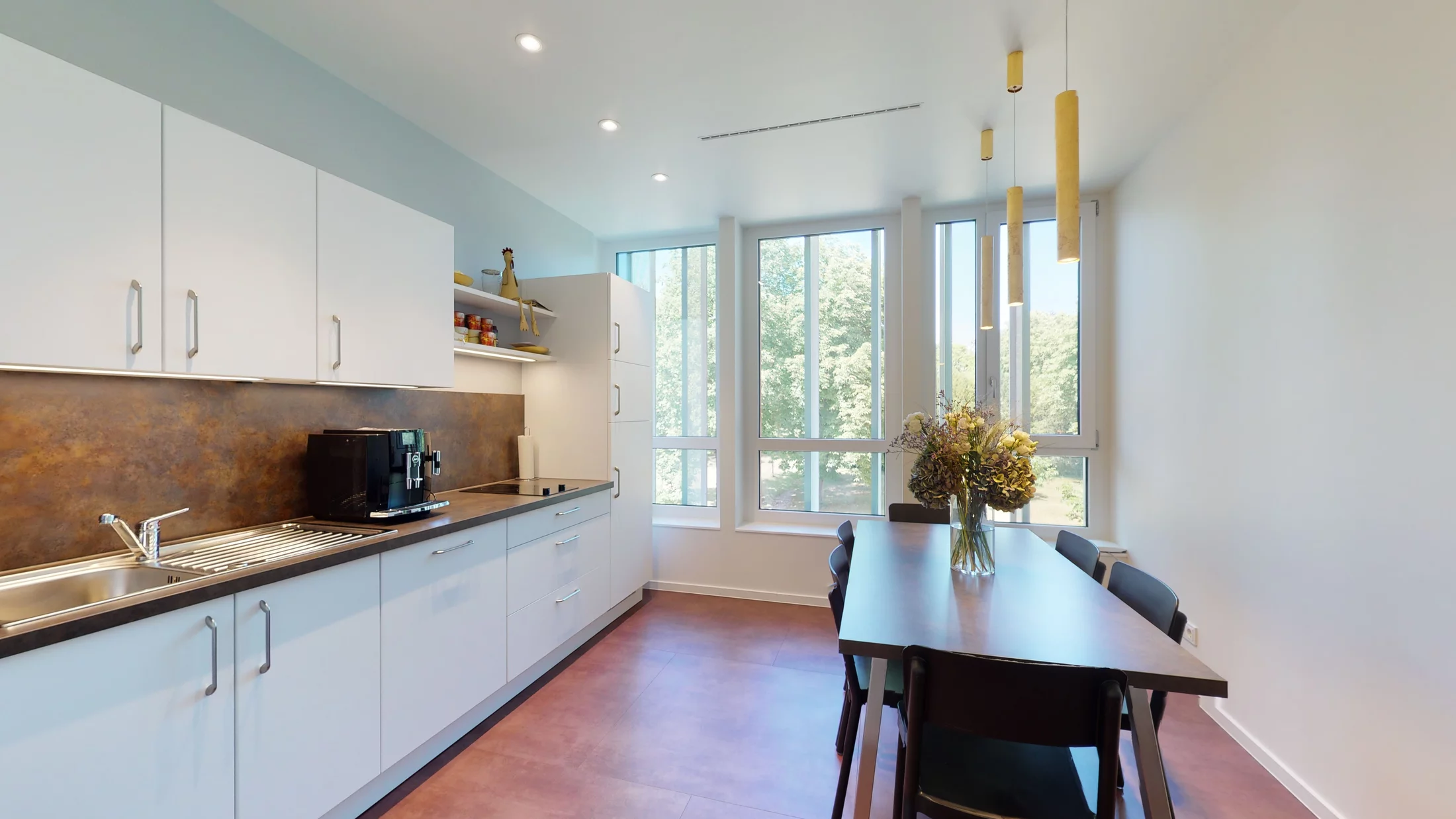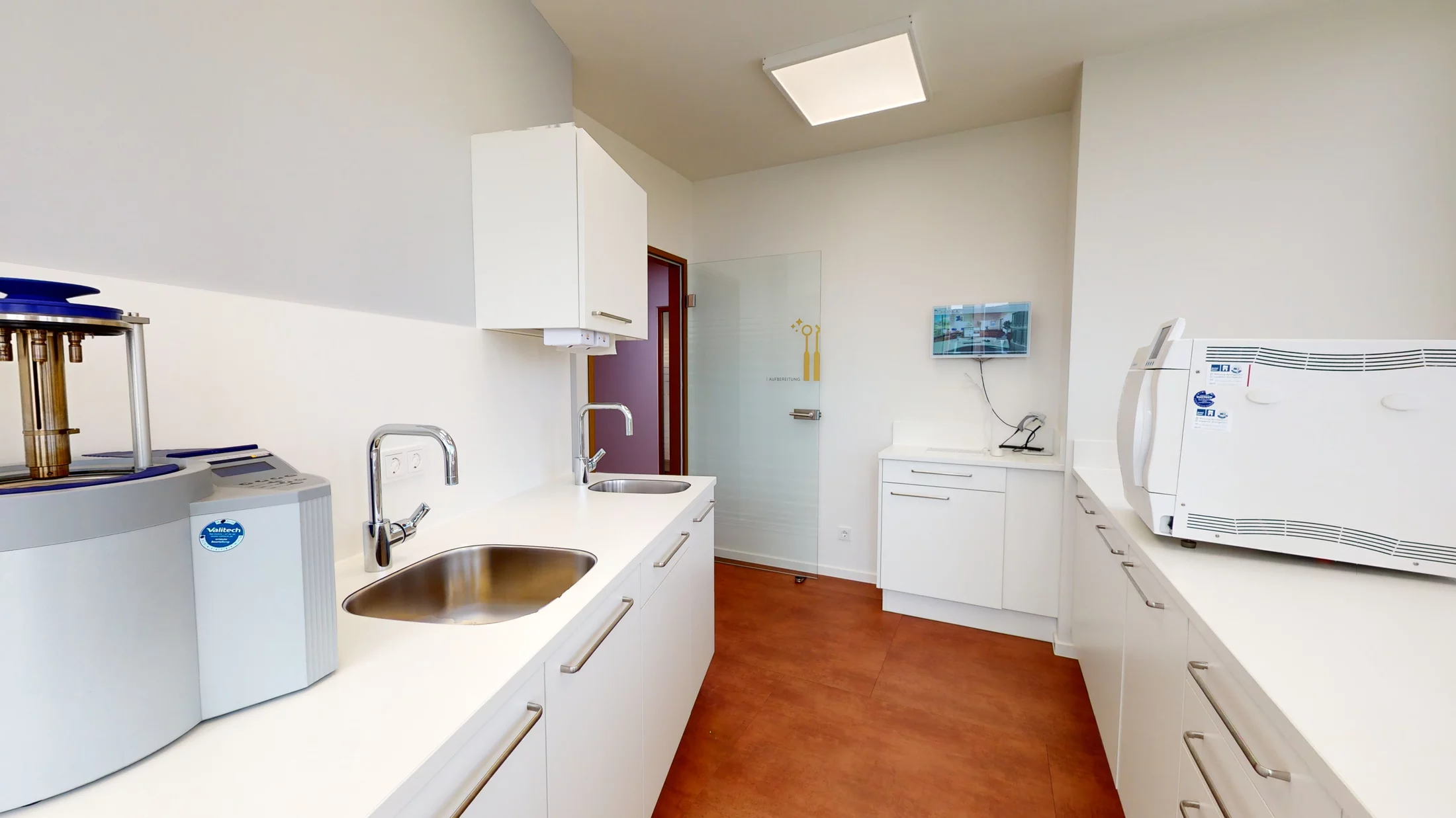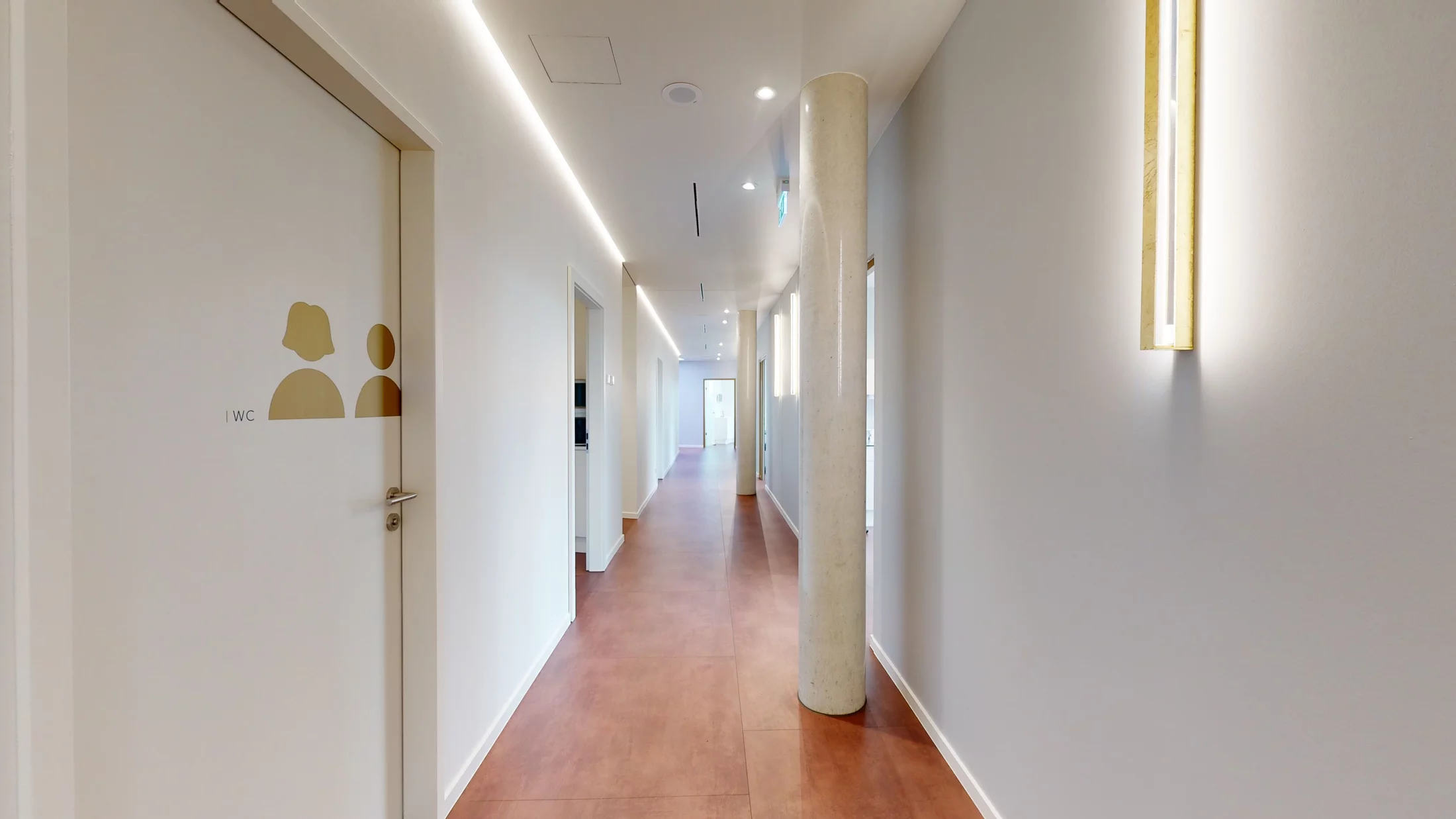 Im gesamten Praxisbereich kommen klassischelegante und zugleich moderne Materialien zum Einsatz. Ein Boden mit leicht schimmerndem Kupfereffekt verbindet die Praxisbereiche zu einem harmonischen Ganzen.