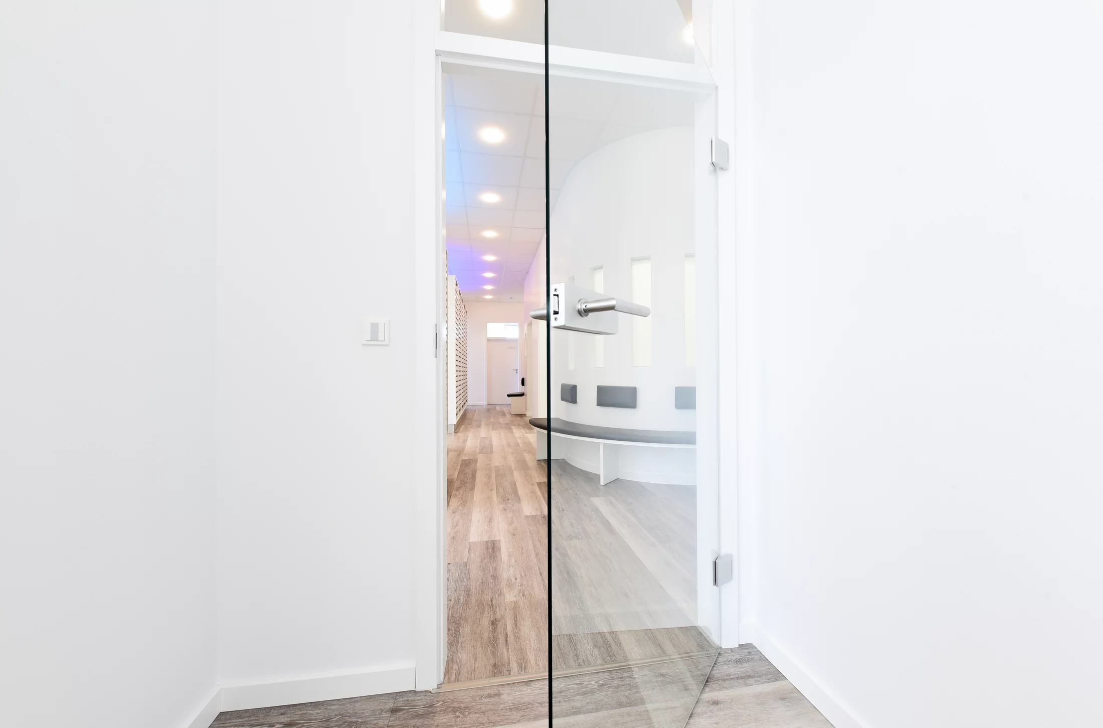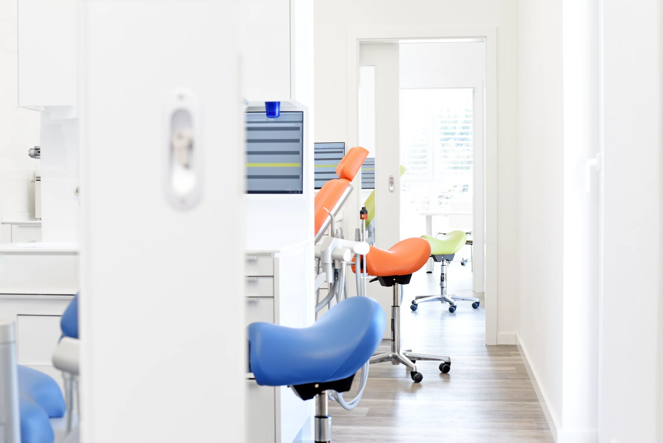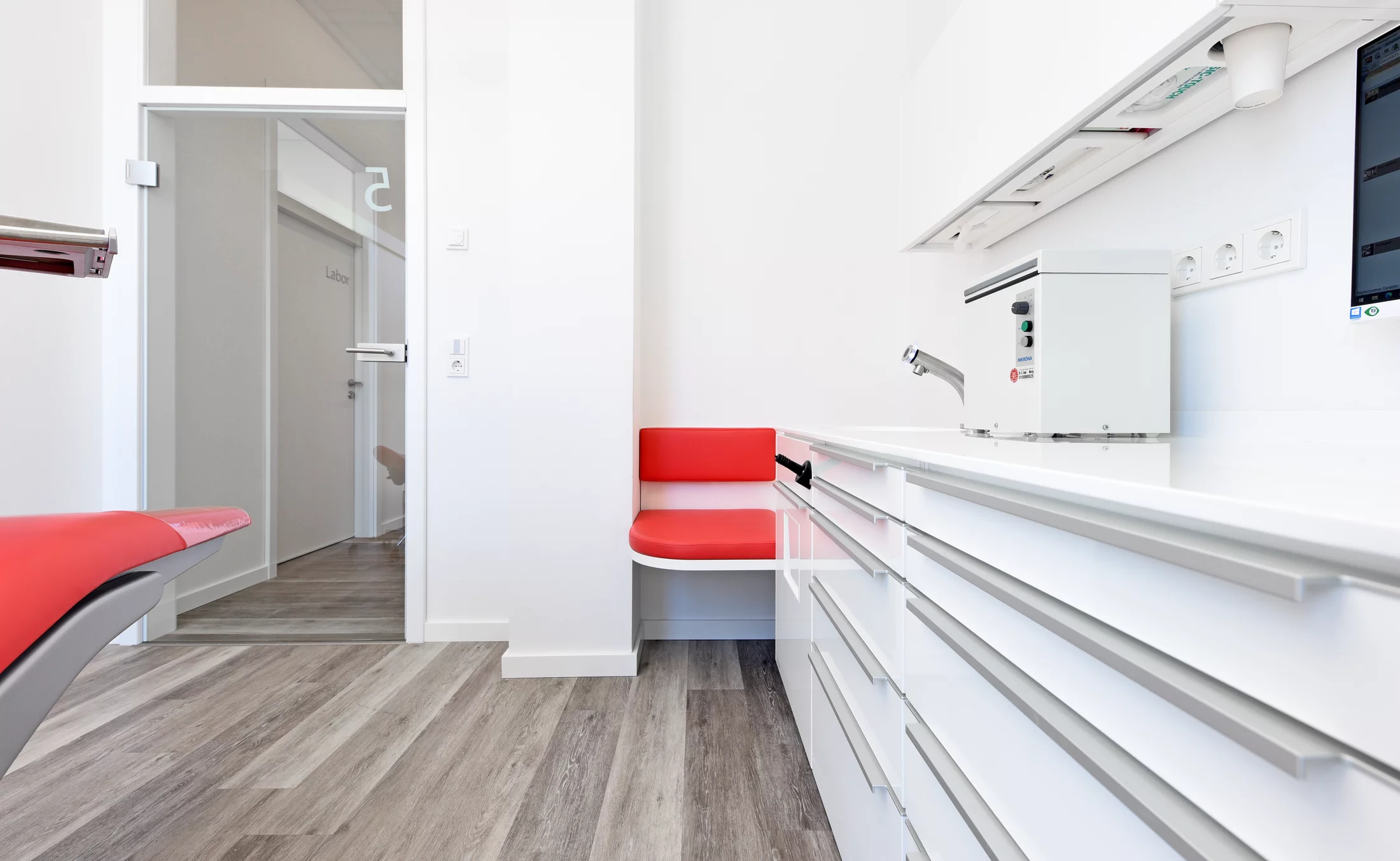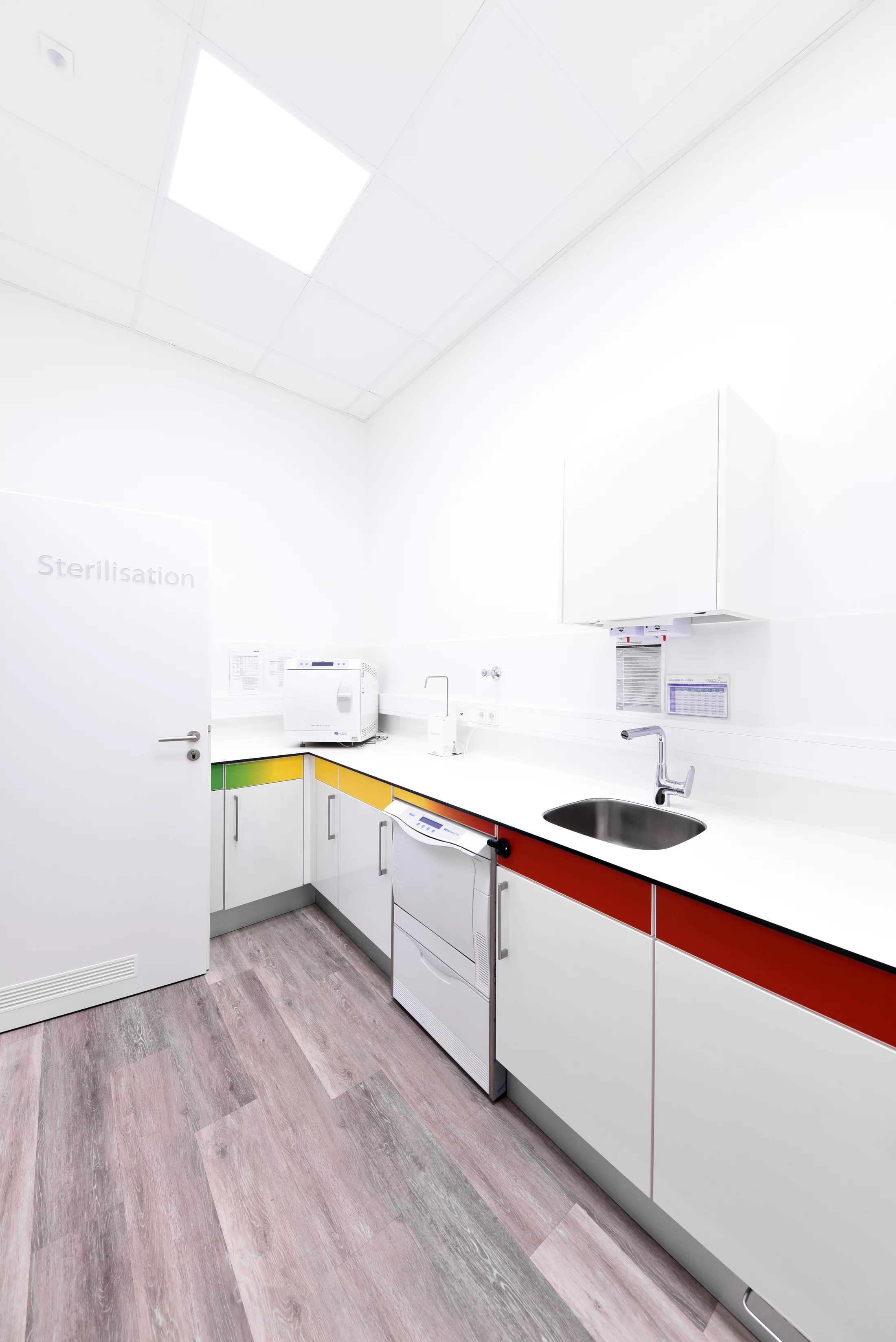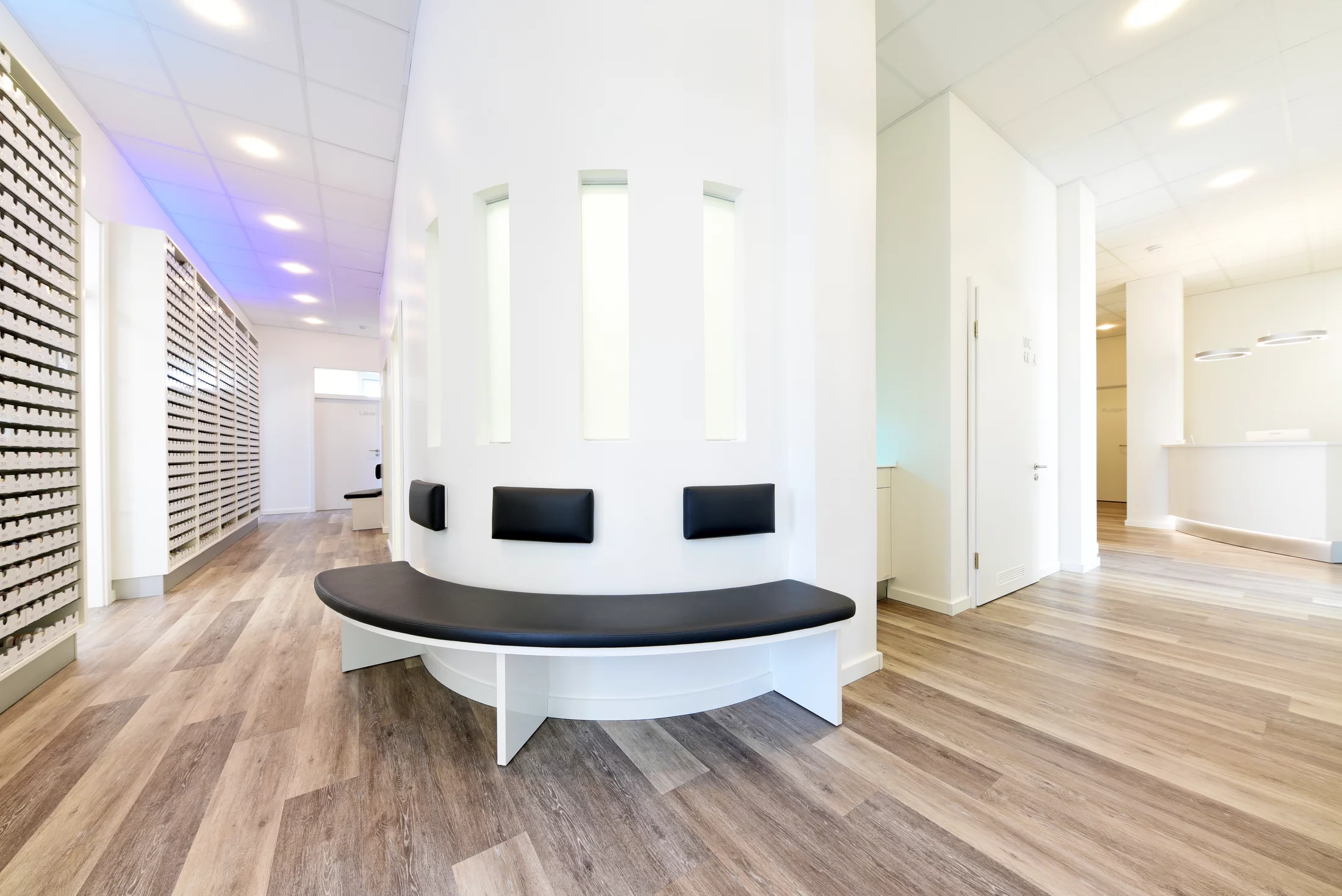 Insgesamt entsteht so eine maximale Klarheit des Raums, die durch den warmen Ton des Bodens aufgefangen wird und mit den eingebetteten Farbkompositionen die Sinne der Patient*innen anspricht.