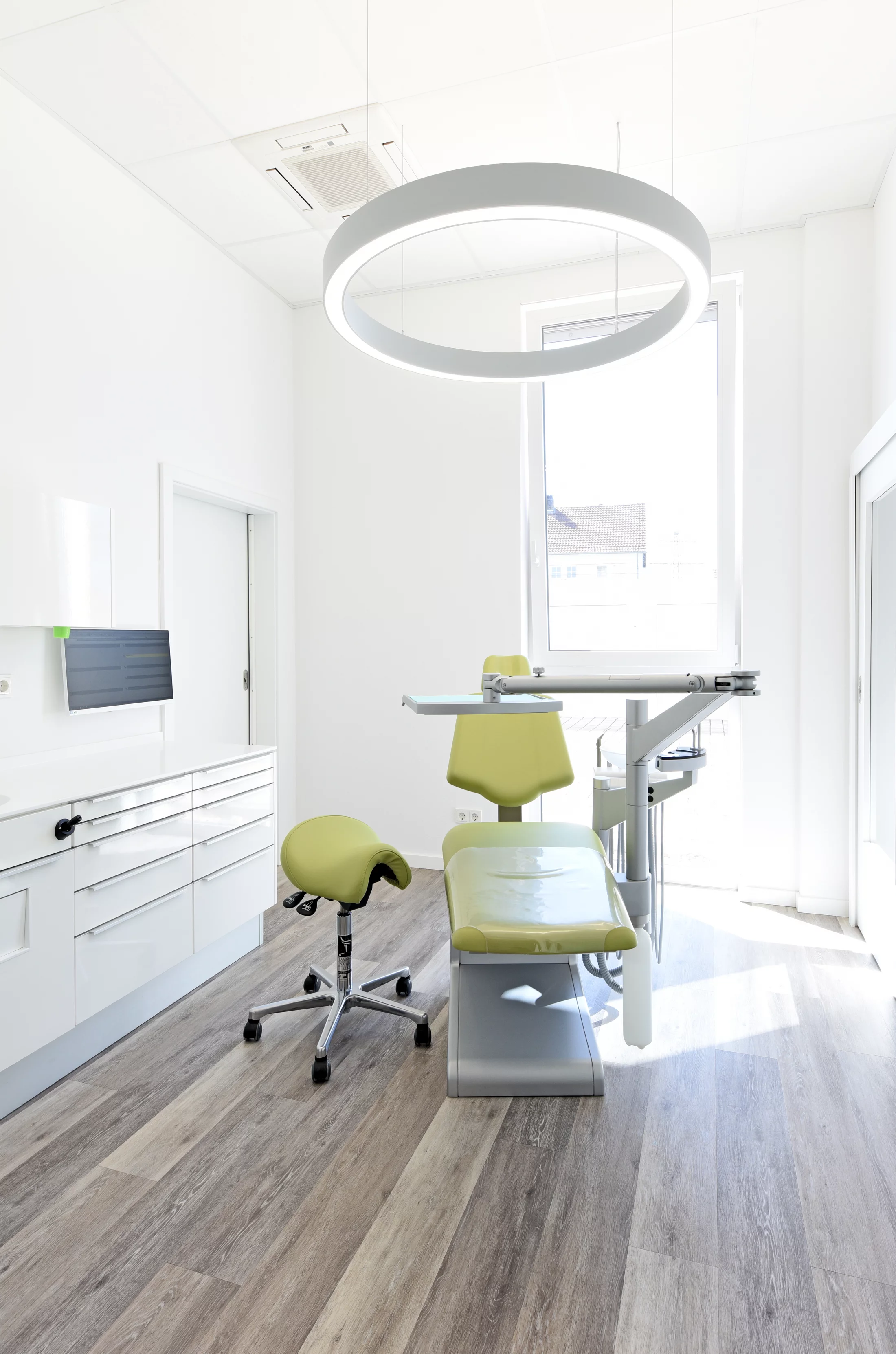 Gesetzt werden die farbigen Akzente durch eine per App gesteuerte LED-Beleuchtung und die bunten Polster der Behandlungsstühle. Ein starker Kontrast zur weißen Raumgestaltung wird auch durch die schwarzen Polsterflächen der Wartemöbel erzielt, ein Kontrast, der optisch für noch mehr Tiefe sorgt. Die Sitzmöbel in den Wartebereichen folgen platzsparend und zugleich formschön der Rundung der zentralen Wand. Dies verleiht dem Raum eine Leichtigkeit, die von den „schwebenden“, ringförmigen Leuchten zusätzlich unterstrichen wird.