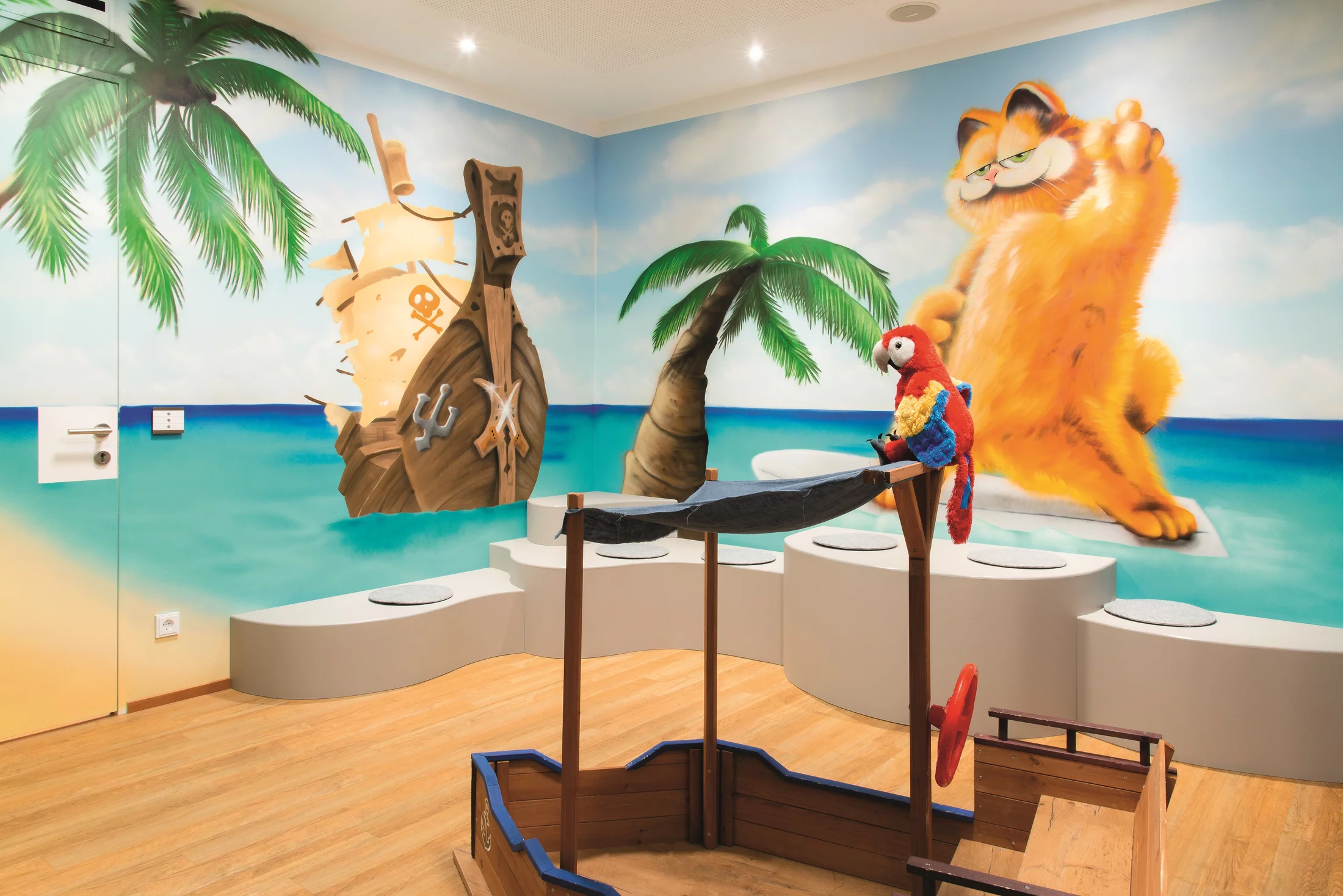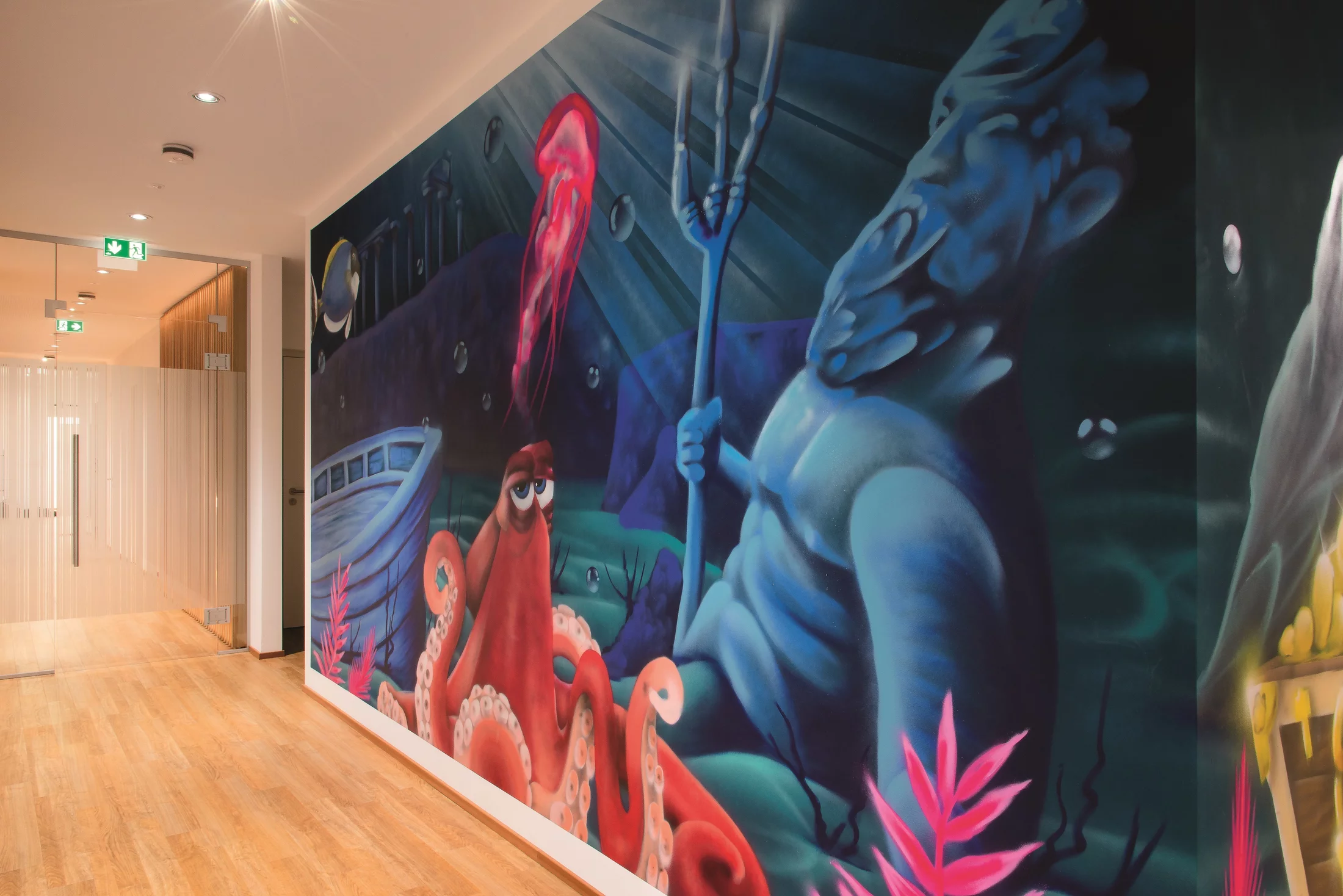 Im Flurbereich werden die Kinder von der Unterwasserwelt des Neptun abgeholt, im Wartebereich von einer Dschungelwelt überrascht. Die Behandlungszimmer sind als Themenzimmer Garfield, Dschungel und Nemo gestaltet worden. In der Erwachsenenpraxis vermitteln die Themen Bergwelt, Meditation und Yacht ein ruhiges Wohlfühlambiente. Wandfüllende, hinterleuchtete Wandbilder sind hier das alleinige Gestaltungselement. Die Möbel wurden in schlichtem Weiß gehalten. Im Yachtzimmer wurden neben der designten Behandlungseinheit „bluemarina“ sowohl die Behandlungszeile als auch das Cerecschleifgerät und der integrierte Laborarbeitsplatz im „bluemarina“- Design umgesetzt.