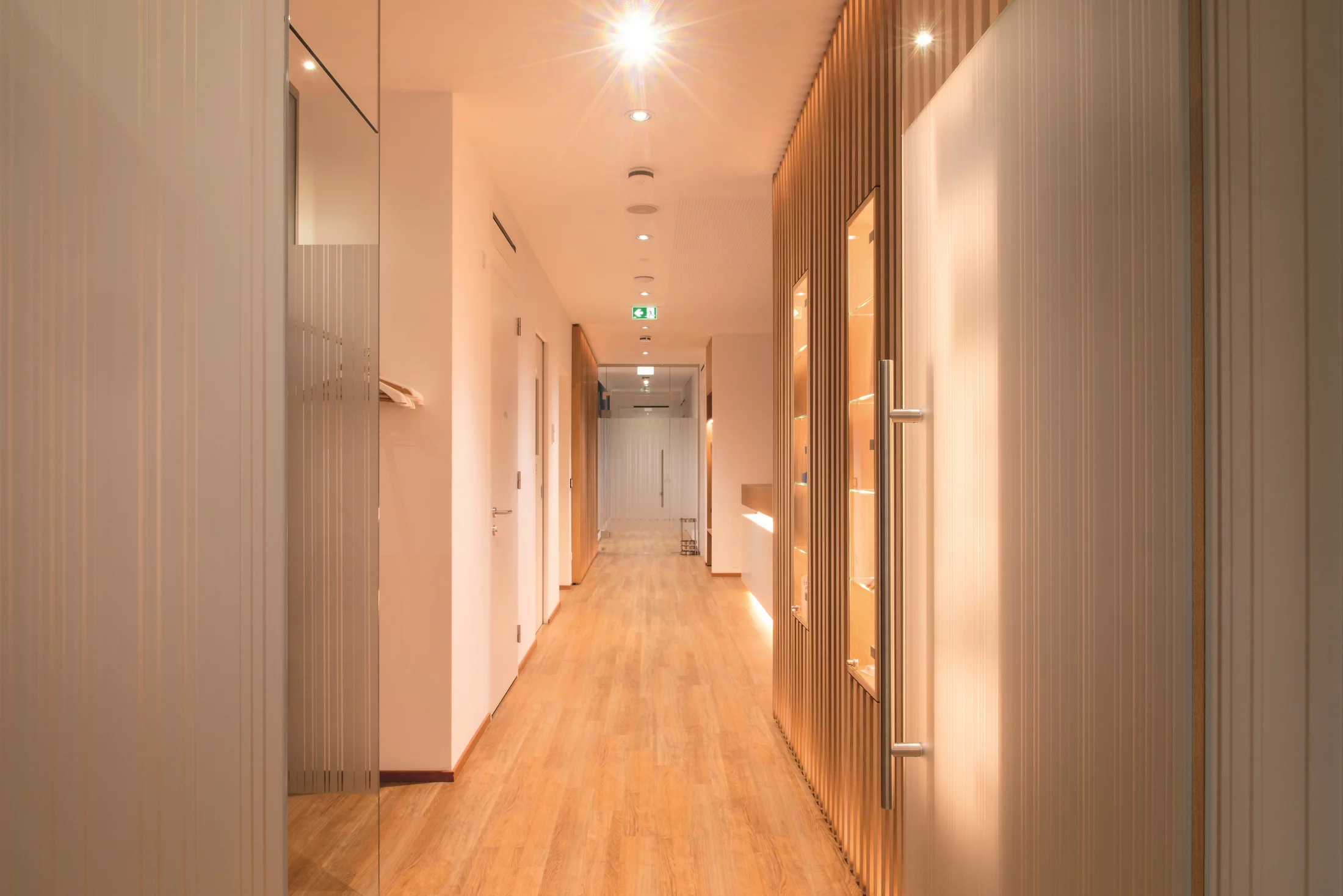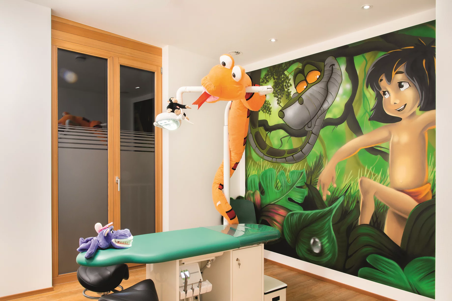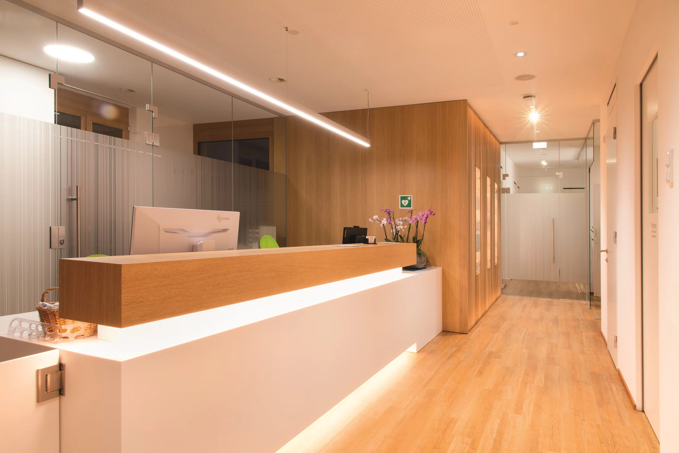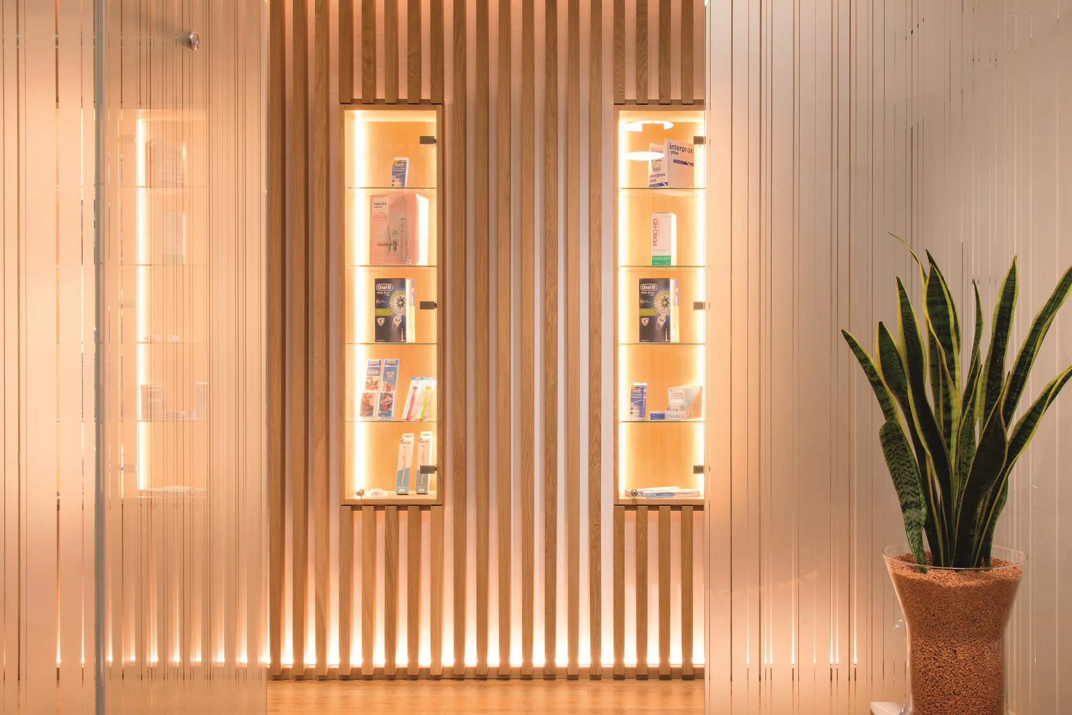 Der gemeinsame Eingangsbereich ist bewusst schlicht gehalten worden mit hellen Farben und warmen Holzmaterialien. Hinterleuchtete, strukturierte Wandverkleidungen mit eingelassenen Vitrinen führen zu den beiden unterschiedlichen Bereichen der Kinderzahnarztpraxis und dem Behandlungsbereich für die Erwachsenen. Die beiden Bereiche wurden mitgroßzügigen Glaselementen abgegrenzt. Dahinter werden die Patient*innen in zwei unterschiedliche Themenwelten geführt. Die Kinderzahnarztpraxis ist bewusst farbig möbliert und mit großflächigen Wandbildern gestaltet worden.