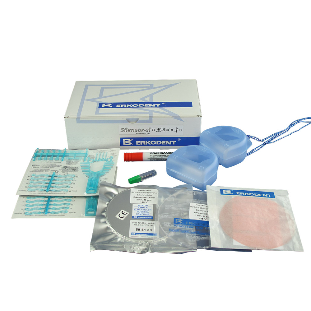 Der Silensor-sl Schnarchschutz besteht aus je einer Schiene für Ober- und Unterkiefer. Über zwei seitlich angebrachte Verbinder positioniert er den Unterkiefer. Das Silensor-sl Herstellset beinhaltet alle Materialien und Hilfmittel zur Herstellung von zwei Silensor-sl. Dazu zwei Erkoboxen zur Aufbewahrung der Antischnarchschiene und Informationsmaterial. Das Antischnarchgerät zeichnet sich aus durch: Schnelle, einfache Herstellung Hoher Tragekomfort Leicht austauschbare Verbinder Deutlich verringerte Lastspitzen und Bruchgefahr durch abfedernde, Propulsionsstöße erlaubende Verbinder Metallfreie Konstruktion Inklusive Protrusionslehre zur einfachen Registrierung der Vorlage