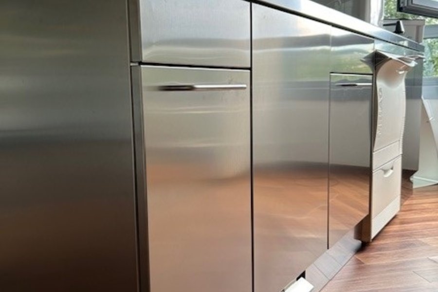 Front, Korpus, Sockel, Arbeitsplatte und Waschbecken: Edelstahl