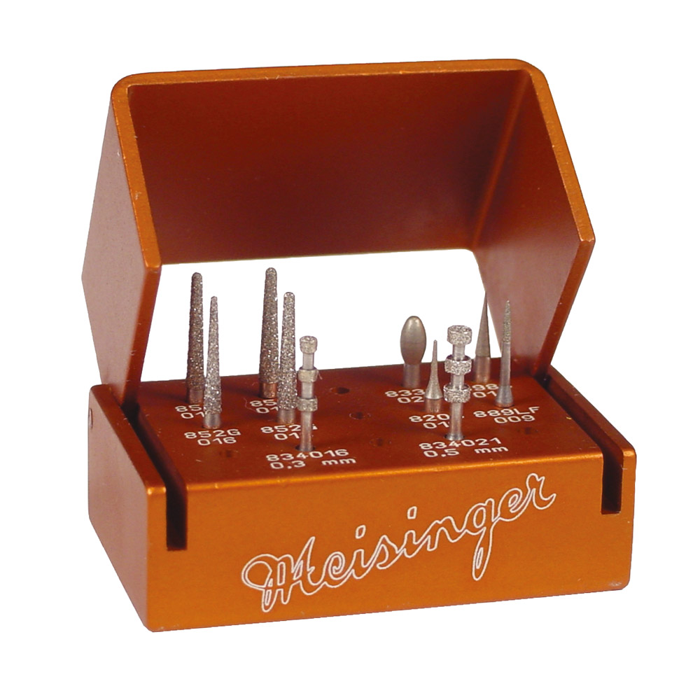 Dieser Satz beinhaltet ein optimal abgestimmtes Sortiment für die Veneerapplikation im Frontzahnbereich. Die Rillenschleifer unterstützen dabei bei der Schaffung einer definierten Schnitttiefe auf der Labialfläche der Zähne. Die Diamantinstrumente 852 dienen insbesondere zur schnellen Abtragung von Zahnsubstanz (labial) bis zur vorbestimmten Tiefe, wobei das Instrument auch palatinal/lingual eingestezt werden kann. Die Diamanten beseitigen sicher überschüssige Substanz im interdentalen Bereich und erlauben das effiziente Finieren des Randes, können zudem aber auch subgingival eingesetzt werden.