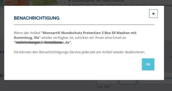 Ist der Service aktiviert, wird Ihnen eine Bestätigung inkl. der Emailadresse angezeigt, an die die Verfügbarkeitsmeldung geschickt wird, wenn der Artikel wieder bestellbar ist: