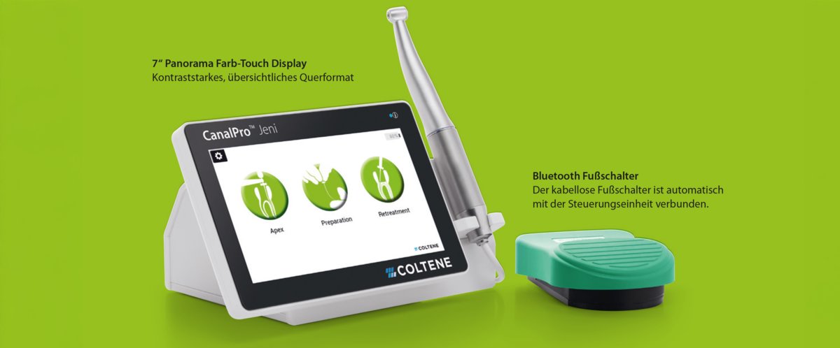 Der CanalPro Jeni Endomotor wird in Deutschland hergestellt und verfügt über ein patentiertes digitales Assistenzsystem. Er unterstützt sicher die mechanische und chemische Aufbereitung und bietet eine integrierte Längenmessung. Die HyFlex- und MicroMega-Feilensysteme sind bereits vorprogrammiert; individuelle Sequenzen können über „Doctor’s Choice“ genutzt werden.