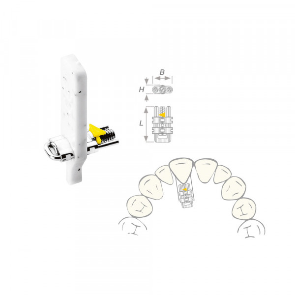 Stabile, skelettierte Dehnschraube mit leuchtgelbem Drehrichtungspfeil für Oberkiefer-Transversaldehnung...