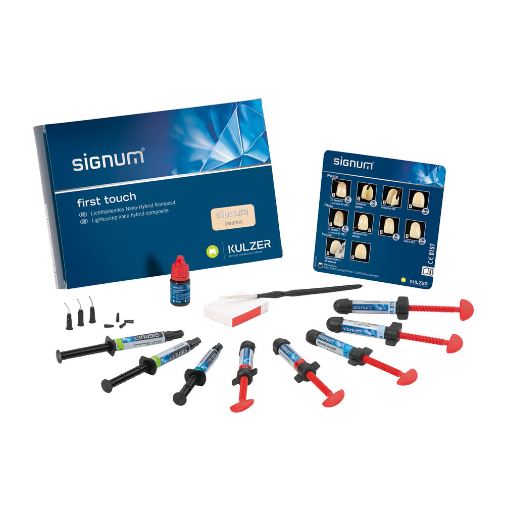 Lernen Sie Signum ceramis im First touch kit mit den Vita classic Farben A2 und A3 kennen! Das speziell entwickelte Glaskeramik-Komposit, für die metallfreie Indikation, vereint die Eigenschaften von Keramik und Komposit zu einem High-Tech Produkt. Zur einfachen und schnellen Erstellung von Inlays, Onlays oder auch Vollkronen im Labor, vor allem im Seitenzahnbereich. Bringen Sie Lebendigkeit in Ihre Restaurationen mit den beiliegenden Effektmassen von Signum ceramis und den Malfarben von Signum cre-active und finishen Sie mit den flow Massen von Signum matrix!