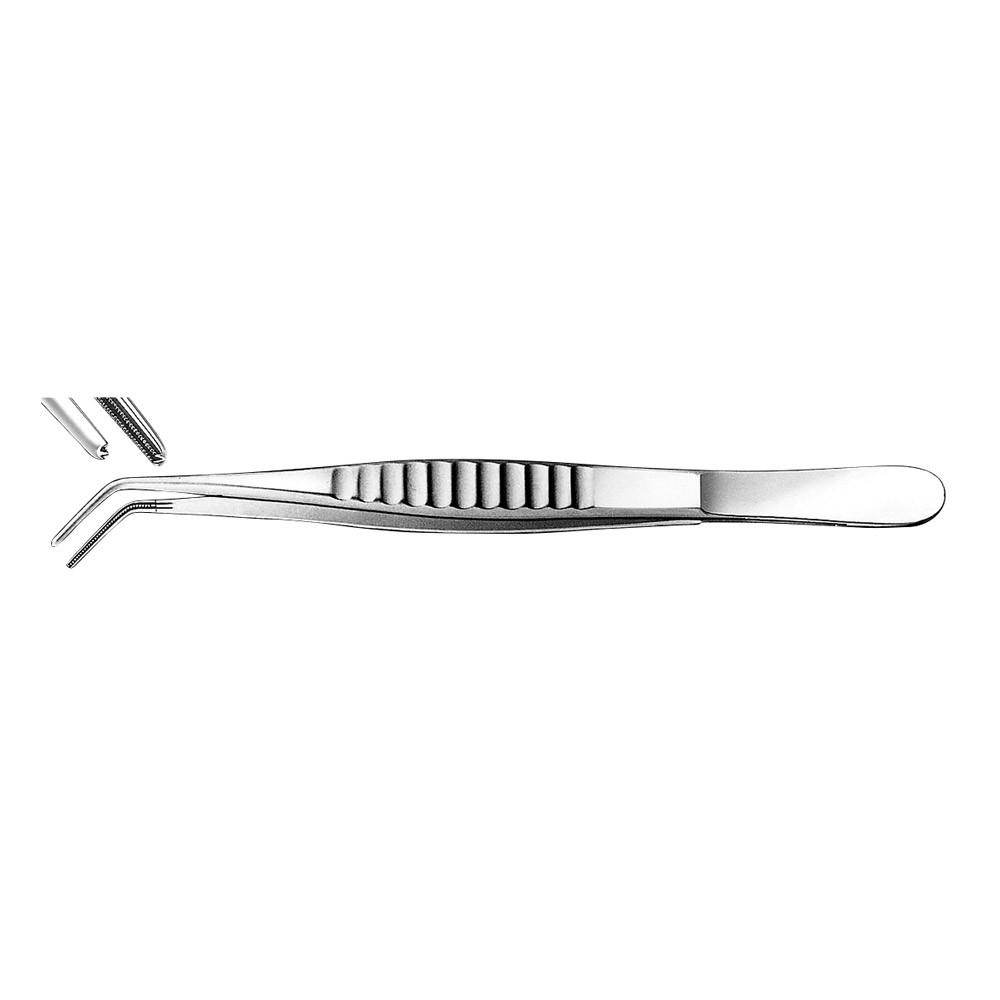 nach De Bakey. Gebogen, zum sicheren Halten von Schleimhautgewebe. Die feine Mikro-Zahnung verhindert eine Perforation des Gewebes.